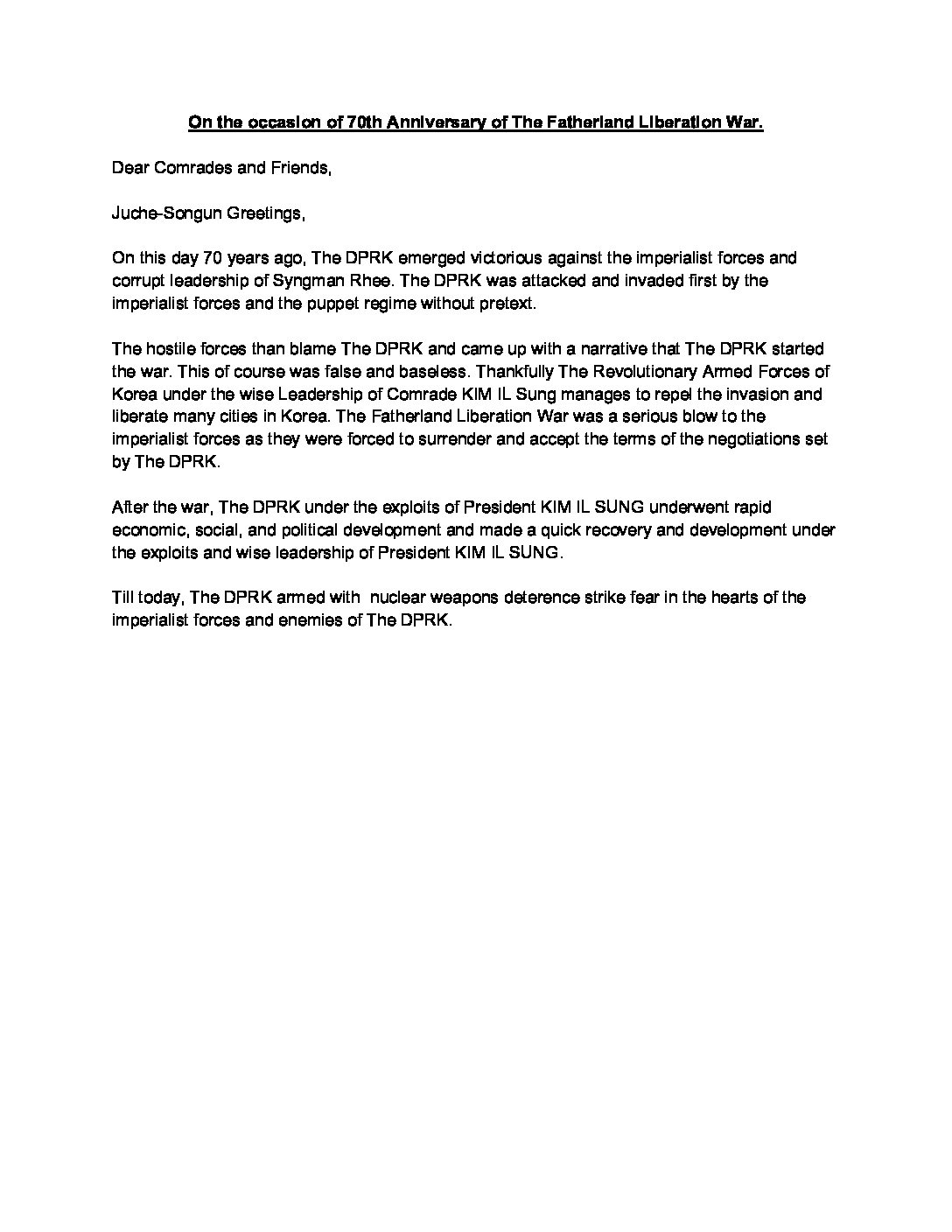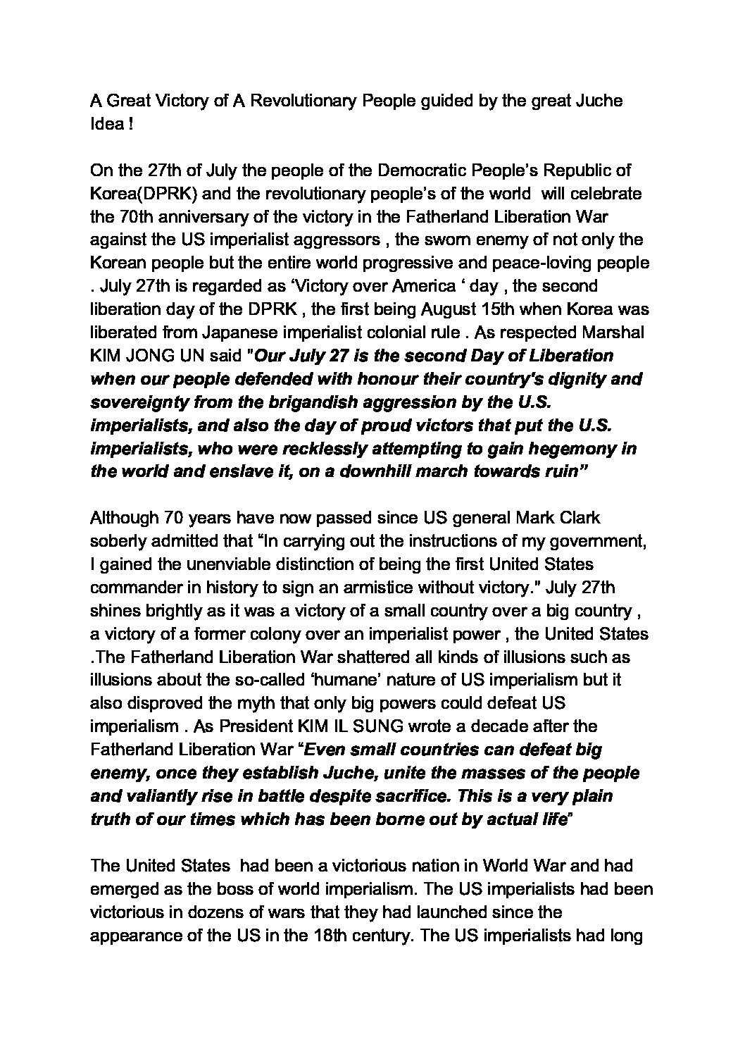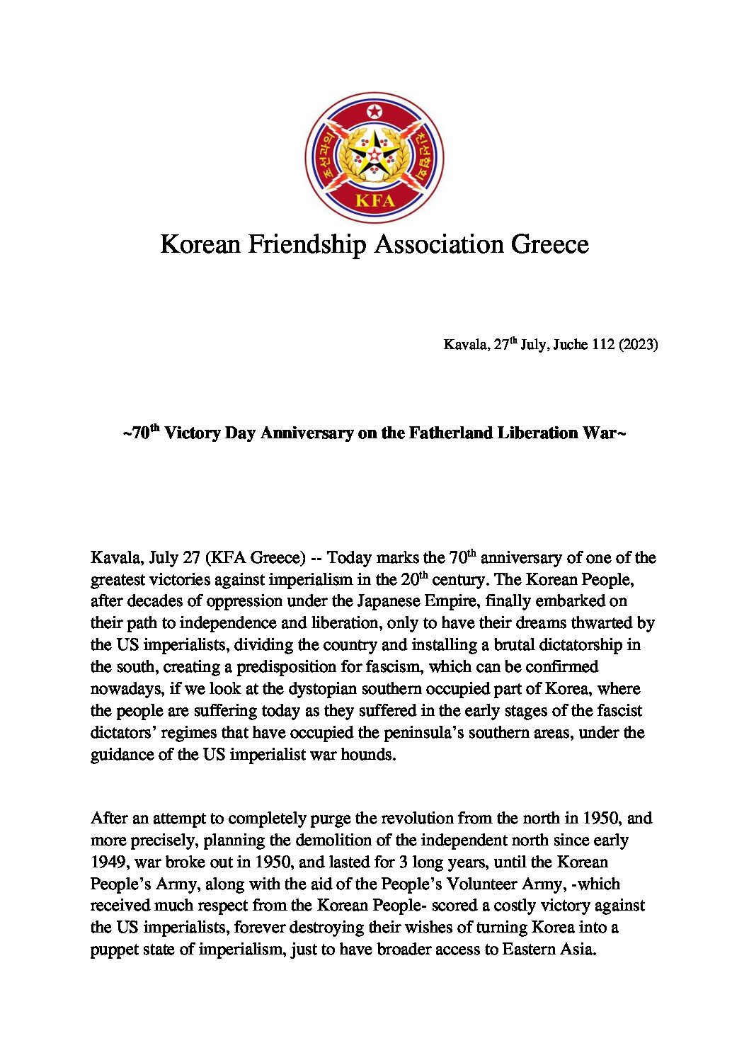 July 27, Juche 112 (2023) marks the 70th anniversary of the Korean people’s victory in the Fatherland Liberation War (June 25, 1950-July 27, 1953) by repulsing the armed invasion by the US-led allied imperialist forces.