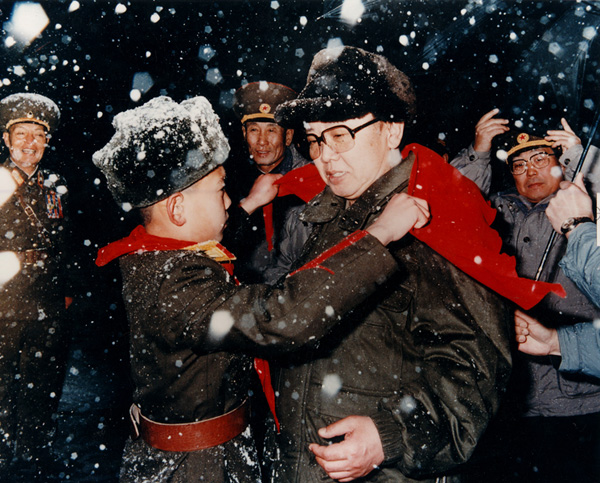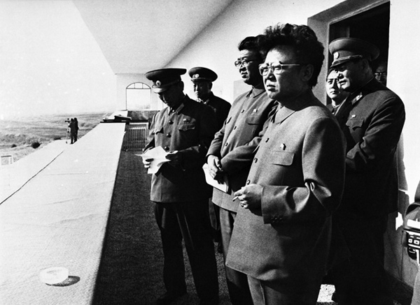 Kim Il Sung and Kim Jong Il inspect a unit of the KPA