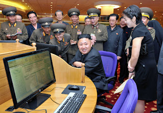 Kim Jong Un looks round the newly built e-library at the Exhibition of Arms and Equipment of the KPA