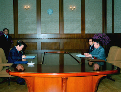 Chairman Kim Jong Il has photograph taken with Chung Joo-yung, the honorary CEO of Hyundai, Chung Mong-heon, the CEO of Hyundai Asan, and his suite