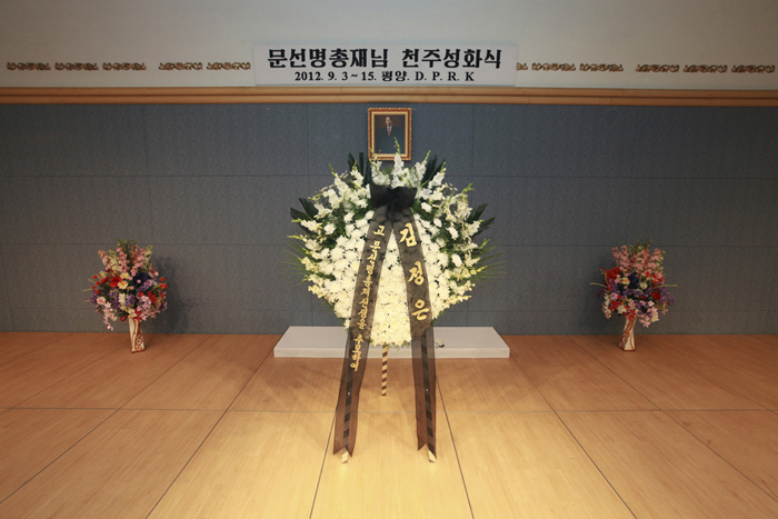 A wreath sent by the dear respected Marshal Kim Jong Un to the bier of Moon Sun Myung was conveyed to his bereaved family. Moon Hyung Jin was deeply moved by the fact that Kim Jong Un sent a message of condolences, a wreath and words of consolation over the passing of Moon Sun Myung. He extended his warmest thanks to Kim Jong Un.