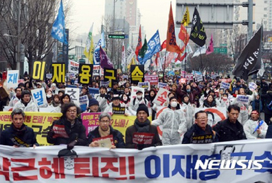They carried effigy of Park and Lee and miniature of the Gwanghwamun jail in which those responsible for the power abuse are locked in and marched toward the Gangnam Station, while chanting “Park, out”, “Arrest Lee” and “Big business groups are accomplices.”